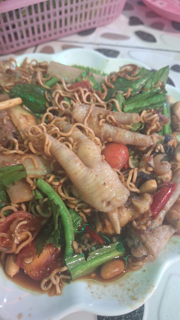Nichts ahnend suchte ich mir danach einen Platz für das Abendessen. Das Restaurant war noch ziemlich leer, ich war relativ früh dran. Die Frau sprach so gut wie kein Englisch und auch meine Übersetzungs-App schien irgendwie nicht richtig zu verstehen, was ich wollte. Es gab zwar eine Speisekarte in etwa A2-Grösse, aber die Bilder darauf waren stark verblichen und kaum noch zu erkennen. Die Preise waren alle ungefähr gleich, also zeigte ich einfach auf irgendetwas, das halbwegs gut aussah – nichts ahnend. Sie nickte und zeigte mit den Fingern: ein oder zwei Chilis. Ein Chili, sagte ich. Ich stellte mich trotzdem darauf ein, dass es scharf werden würde. Was ich bekam, war ein Teller mit Ramen-Nudeln, Gemüse und einer Sauce. Soweit gut. Aber scharf. Als ich auf etwas biss, das wie eine Bambusstange aussah, sich aber eher wie Gummi anfühlte, dachte ich mir noch: nicht zu viel darüber nachdenken. Kurz darauf spürte ich etwas Hartes, das aussah wie ein Pouletflügel. Und dann kam plötzlich ein Hühnerfuss zum Vorschein. Ich musste mich zusammenreissen. Unter den Nudeln versteckte sich ein ganzer Haufen Knochen – wohl so ziemlich alles vom Tier. Je länger ich die Knochen ansah, desto schlechter wurde mir. Ich fühlte mich zwar etwas schlecht, den Teller voll stehen zu lassen, aber das war zu viel. Auch wenn ich sonst offen bin und gerne Neues probiere, vor allem die lokale Küche – der Appetit war mir vergangen.